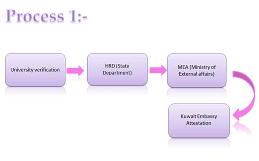 For Educational certificate attestation we have two procedures, First one starts with University Verification, after which State authentication (HRD) followed by MEA(Ministry of External Affairs)which is time consuming procedure and not mandatory for KUWAIT(Mandatory for only education sector). Second procedure starts with Notary public followed by Sub Divisional Magistrate (SDM) MEA (Ministry of External Affairs) followed by KUWAIT Embassy attestation. Both processes are valid for getting job in Kuwait.