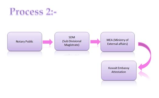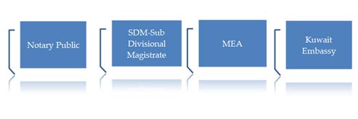 - SDM process starts with Notary public attestation from local Notary followed by Sub Divisional magistrate (SDM), after which MEA (Ministry of External Affairs) and finally submit the document to Kuwait Embassy for embassy attestation.