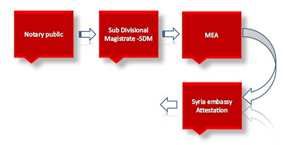 - SDM process starts with Notary public attestation on certificate from local Notary followed by Sub Divisional magistrate (SDM)attestation, after wich we will submit the document to MEA (Ministry of External Affairs) to get the indian ministry verification and finally submit the document to Syria Culture and then to Syria Embassy for attestation.
