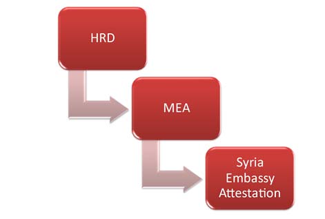 Educational certificate attestation we have two procedures, First one is start with University Verification, after which State authentication (HRD) followed by MEA(Ministry of External Affairs)then submit to Syria culture and after which for Syria Embassy attestation. However, this process is time consuming procedure and not mandatory for Syria (Mandatory for only education sector).